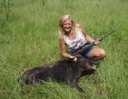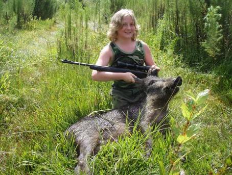 We started in a swamp buggy with two dogs caged in the back. The main guide explained the gun parts and safety button to Matt. He is also familiar with me having guns and knows how to hold and be responsible with them. We both ended up using a 243 Rifle. The main guide then let Matt take a few practice shots. He has shot a gun before and done well with the boy scouts. So, off we go and the decision is made that if we see tusks, I shoot, and if we don't, Matt shoots. Well, we didn't see anything, so released the dogs and they were on a boar rather quickly, but they were in some real thick swamp brush. My only and major complaint is that the one dog would NOT get off the boar and I would NOT shoot while he was so close. Safety on, safety off, safety on, safety off. Damn Dawg . . . Stupid Dawg . . . I eventually got off a shot, but a poor one (hit the boar in the leg) and the boar ran out of the swamp weeds and into a clearing where he gave me a perfect broadside shot, except for Brownie, the dang dawg. Finally, when he (the dawg) was far enough away, I took my second shot, the hog hunched up, ran about 10 feet and fell on his side. Matt's turn . . . We rode around in the swamp and brush and wooded area looking in the shade because by now it was hot and figured that they, the hogs, would be looking for some cool cover. Nothing, so once again, the dogs were let loose. They quickly came upon a few differnt hogs, so Matt attempted the closest, which was in about 6 feet of real thin swamp grass. His first shot was a neck shot and she squeeled and squeeled but did not run. The two other guides got off the swamp buggy and had to physically pull the dogs off, before Matt could finish off his sow. The main guide guessed my boar to be at 140-150 and Matt's sow to be around 130, although I think he was being just a little generous. A great hunt for both Matt and I. I am very proud of Matt's FIRST kill. He handled the gun in a safe manner, and he did not hesitate to shoot when told it was ok to do so. |